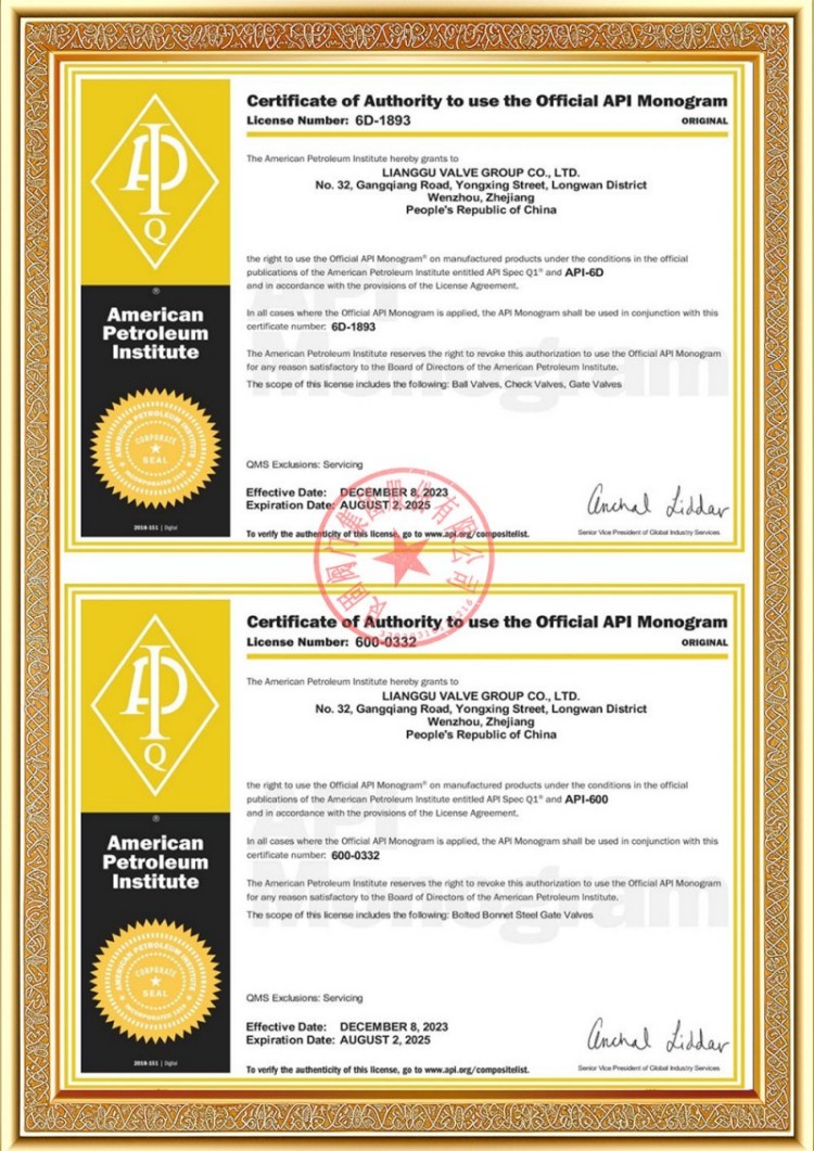 تمتلك شركتنا العديد من تراخيص إنتاج صمامات أنابيب الضغط، وقد حصلت منتجاتنا على شهادات TS A1 وISO 9001 وISO 14001 وISO 45001 وAPI 6D وAPI 600 وAPL 609 وCE/PED وAPI 607 وAPI 6FA وISO 15848-1 ونظام EAC وشهادات المنتج. لدينا أيضًا شهادات براءة اختراع للصمامات المختلفة مثل الصمامات الكروية وصمامات الفراشة وصمامات الأمان والصمامات الحابسة.